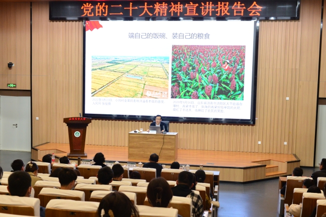 徐劍波指出,黨的二十大報告對新時代新征程“三農(nóng)”工作作出了“全面推進鄉(xiāng)村振興”“加快建設農(nóng)業(yè)強國”“全方位夯實糧食安全根基”等一系列重要決策部署,提出要“扎實推動鄉(xiāng)村產(chǎn)業(yè)、人才、文化、生態(tài)、組織振興”,這為新時代新征程“三農(nóng)”工作指明了前進方向,提供了根本遵循。作為農(nóng)業(yè)高校,我們要特別認真學習其中的涉農(nóng)關鍵詞和重要論述,立足自身、把握重點,切實把學習宣傳貫徹黨的二十大精神與學校第八次黨代會確定的各項目標任務結(jié)合起來,與加快建設一流農(nóng)業(yè)大學結(jié)合起來,以實際行動助推中國式農(nóng)業(yè)農(nóng)村現(xiàn)代化建設,努力為全面建設社會主義現(xiàn)代化國家、全面推進中華民族偉大復興作出新的山農(nóng)貢獻。