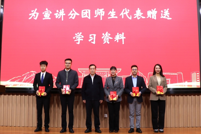 宣講報告前,徐劍波為學校五個宣講分團的師生代表贈送學習資料,并為宣講團授旗。宣講結(jié)束后,徐劍波還與學生代表進行了互動交流。