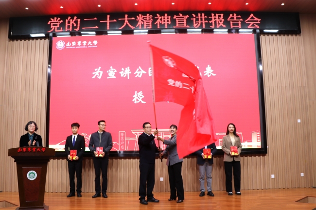 11月16日上午,學校舉辦黨的二十大精神宣講報告會暨宣講啟動儀式。山東農(nóng)業(yè)大學黨的二十大精神宣講團團長、黨委書記徐劍波以“學習宣傳貫徹黨的二十大精神 爭做知農(nóng)愛農(nóng)強農(nóng)興農(nóng)時代新人”為題,為學校師生代表作宣講報告。黨委副書記張然主持報告會。