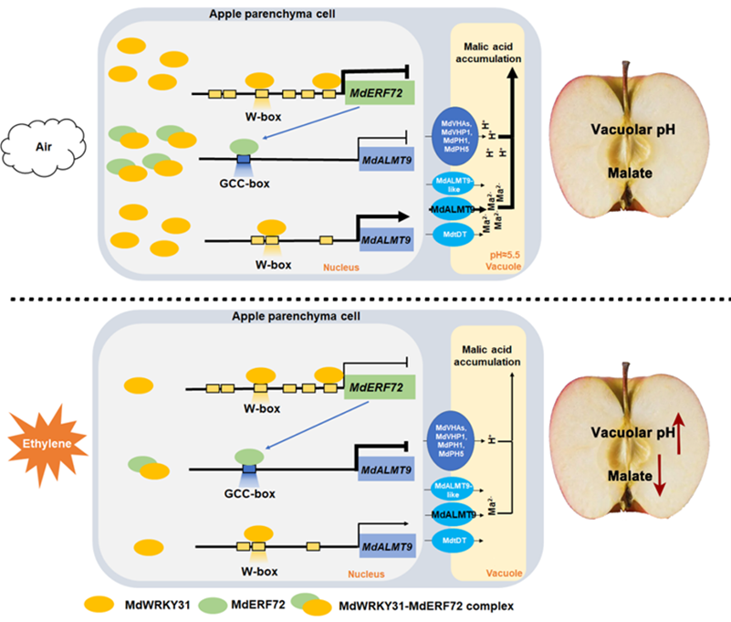 進一步以MdERF72蛋白為誘餌,利用酵母雙雜交篩庫實驗,獲得一個與MdERF72互作的WRKY家族轉錄因子MdWRKY31,并且MdERF72與MdWRKY31蛋白間的相互作用,緩解了MdERF72對MdALMT9的轉錄抑制活性。除了蛋白間的相互作用,MdWRKY31也可以直接結合MdERF72和MdALMT9的啟動子,分別在轉錄水平抑制MdERF72和激活MdALMT9基因表達。最終,提出乙烯通過抑制MdWRKY31表達,抑制其與MdERF72和MdALMT9的調控和相互作用,進而直接和間接降低了MdALMT9表達,導致液泡中蘋果酸積累減少和果實酸度降低,降低蘋果果實風味和貯藏性能。