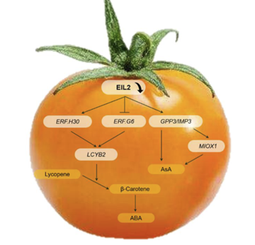 乙烯響應因子(ERFs)是乙烯響應途徑中EIN3下游的典型組分。通過對ERF家族成員的全面篩選,我們發現SlEIL2直接參與調控四種SlERFs的表達。其中兩個ERF成員,SlERF.H30和SlERF.G6參與調控編碼番茄紅素-β-環化酶2 的基因SlLCYB2的表達,該酶介導了果實中番茄紅素向β-胡蘿卜素的轉變。此外,抑制SlEIL2 能夠直接促進 SlGPP3和SlMIOX1 基因的表達,通過L-半乳糖途徑和肌醇途徑影響果實中AsA的生物合成。抑制SlEIL2導致AsA增加1.62倍。
