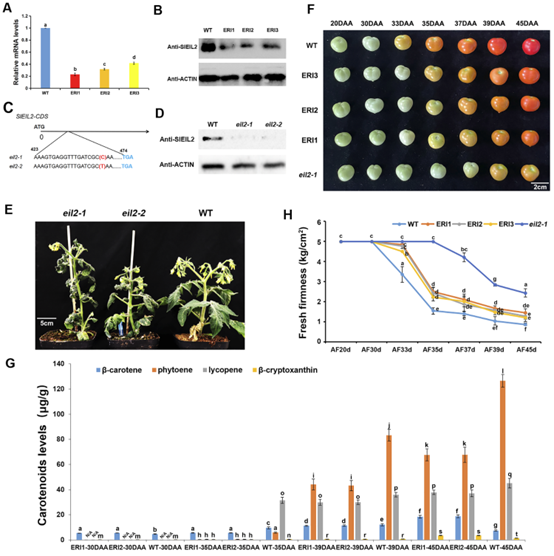 ETHYLENE-INSENSITIVE 3/ETHYLENE-INSENSITIVE 3-LIKEs (EIN3/EILs)是果實成熟過程中乙烯響應的重要因子。該研究發現EIL2控制番茄(Solanum lycopersicum)的類胡蘿卜素代謝和抗壞血酸(AsA)的生物合成。與野生型(WT)授粉45天后呈現的紅色果實相比,CRISPR/Cas9 eil2突變體和SlEIL2 RNAi系(ERIs)的果實呈現黃色或橙色果實。對ERI和WT成熟果實轉錄組和代謝組數據的相關性分析表明,SlEIL2參與β-胡蘿卜素和AsA的積累。