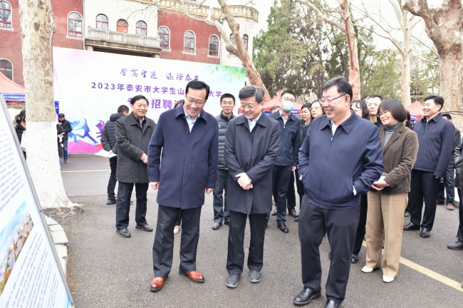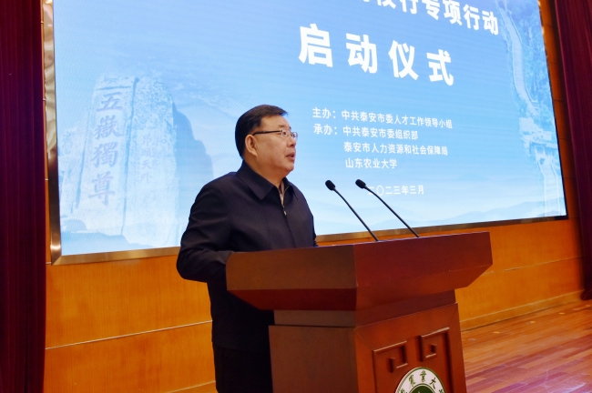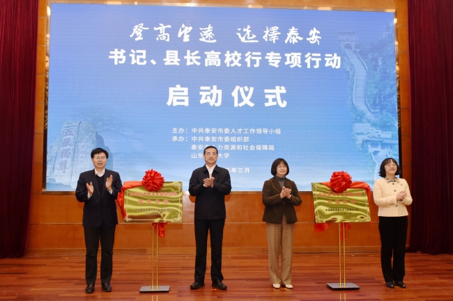 泰安市委常委、組織部部長劉泮英介紹泰安市青年人才政策和專項行動總體安排,市委常委、秘書長張穎出席,副市長馬保文主持啟動儀式。學校有關部門主要負責同志和部分應屆畢業生代表參加活動。