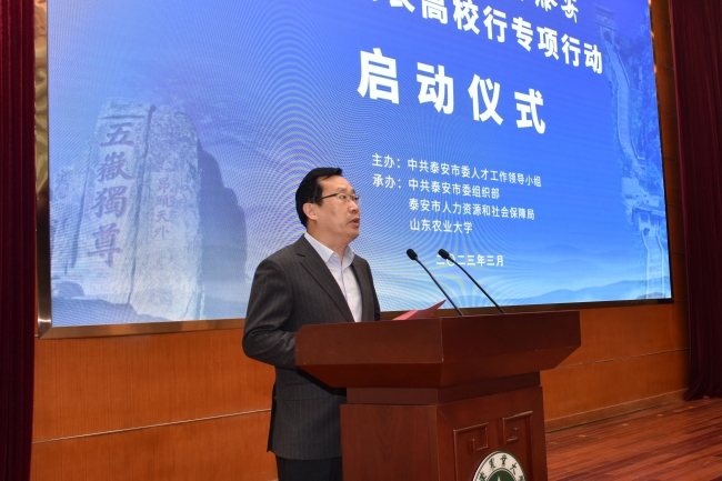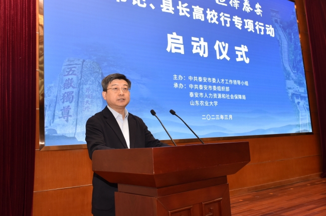 3月17日,“登高望遠 選擇泰安”書記、縣長高校行專項行動啟動儀式在我校成功舉辦。省委組織部副部長龔文東,山東農業大學黨委書記徐劍波,泰安市委書記、市人大常委會主任楊洪濤出席活動并致辭。省人社廳副廳長周春艷,山東農業大學黨委副書記、校長冷暢儉,泰安市委副書記、市長李蘭祥,黨委副書記張然出席。