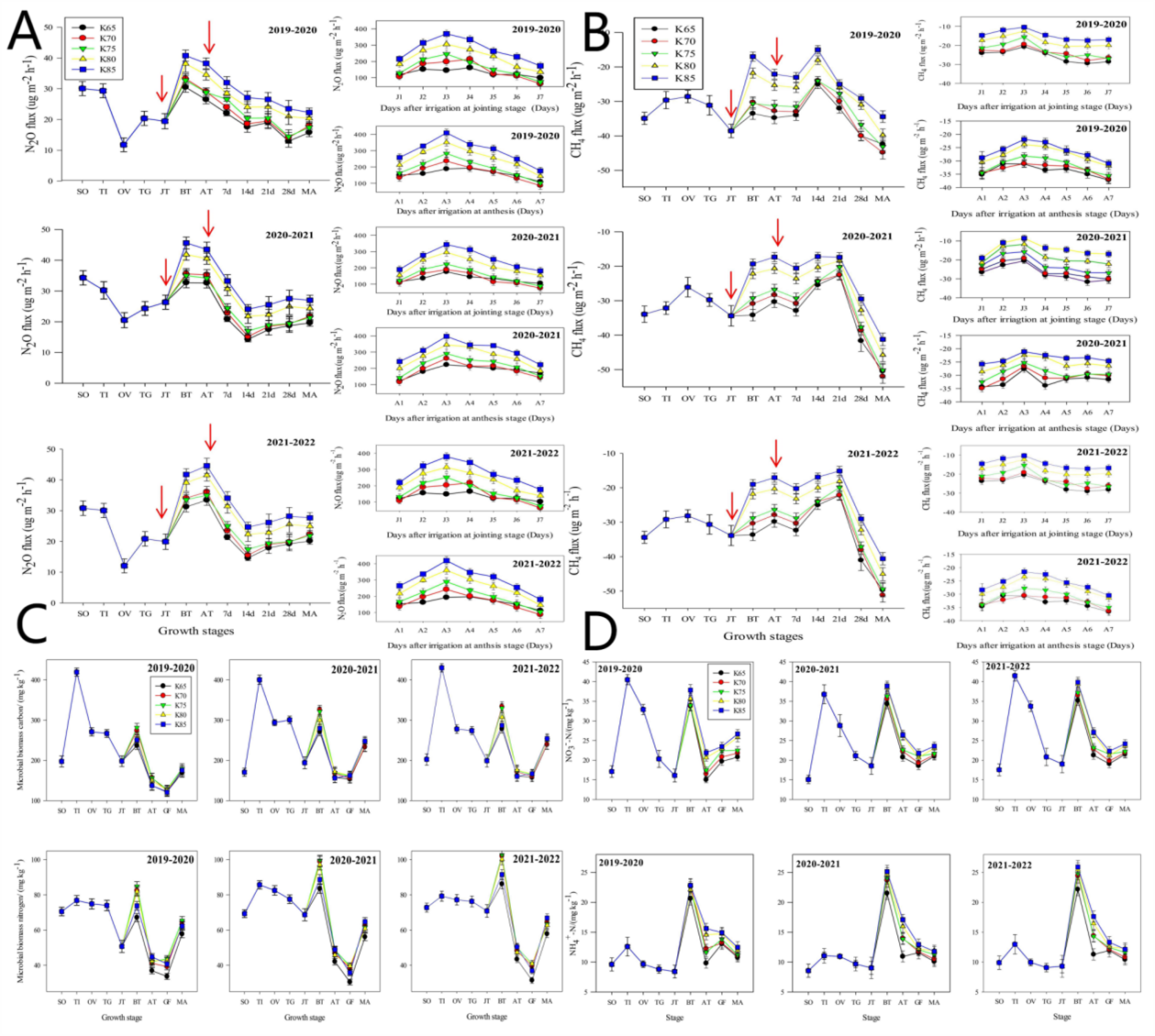 過(guò)量灌溉和降水會(huì)增加土壤有機(jī)物厭氧分解產(chǎn)生CH4排放和土壤反硝化產(chǎn)生的N2O排放,同時(shí)伴隨著CO2排放。該研究發(fā)現(xiàn),增加灌溉量顯著提高了冬小麥生長(zhǎng)季土壤N2O的排放,K85處理灌溉產(chǎn)生的較高土壤濕度促進(jìn)土壤硝化作用,誘發(fā)大量的N2O排放。此外,K85處理下的土壤無(wú)機(jī)氮含量高,為土壤硝化和反硝化提供了反應(yīng)基質(zhì),增加麥田土壤的N2O排放。同時(shí),相關(guān)分析的結(jié)果表明,N2O通量與土壤水分、NO3--N和NH4+-N含量呈正相關(guān)。結(jié)果表明,適當(dāng)?shù)墓喔人剑↘75)可通過(guò)降低無(wú)機(jī)氮含量來(lái)減少土壤N2O排放。