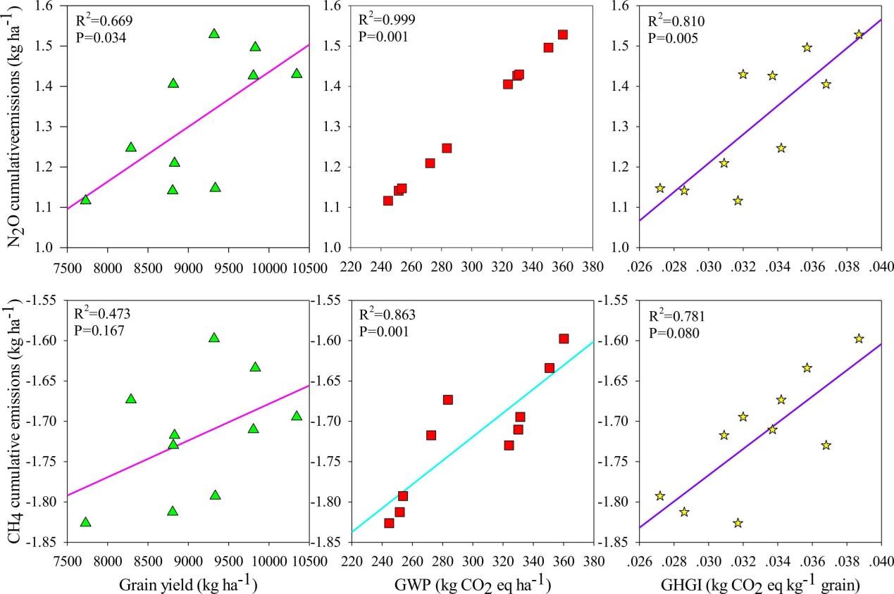 圖2. 糧食產(chǎn)量、全球變暖潛能值(GWP)和溫室氣體強(qiáng)度(GHGI)與溫室氣體排放之間的關(guān)系