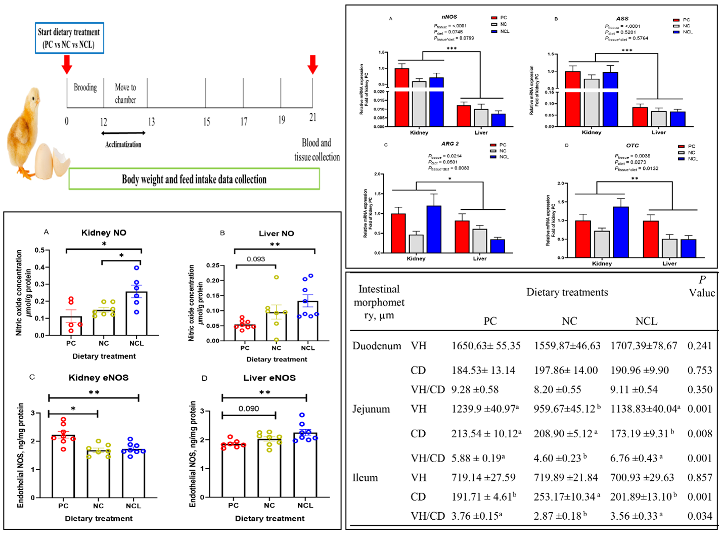 精氨酸是肉雞營養中的第五限制性氨基酸,對家禽的蛋白質合成、免疫和生產性能至關重要。由于現代肉雞品系經歷快速生長和蛋白質沉積,表現出精氨酸-賴氨酸拮抗作用,并且具有有限的內源性合成,因此肉雞日糧精氨酸需求需要優化。精氨酸和L-瓜氨酸都是尿素循環中的代謝中間體,通過酶促反應,L-瓜氨酸可以轉化為精氨酸或一氧化氮(NO)。本研究比較了精氨酸(PC)和L-瓜氨酸(NCL)對精氨酸缺乏(NC)肉雞的日糧補充效果。如圖1所示,評估了肉雞的生產性能、血液生化指標、氨基酸譜、組織濃度和精氨酸代謝酶的基因表達、腸道形態以及腸道中營養轉運蛋白和緊密連接蛋白的基因表達。結果表明,L-瓜氨酸支持精氨酸代謝和一氧化氮合成,并進一步提供肉雞腸道功能。