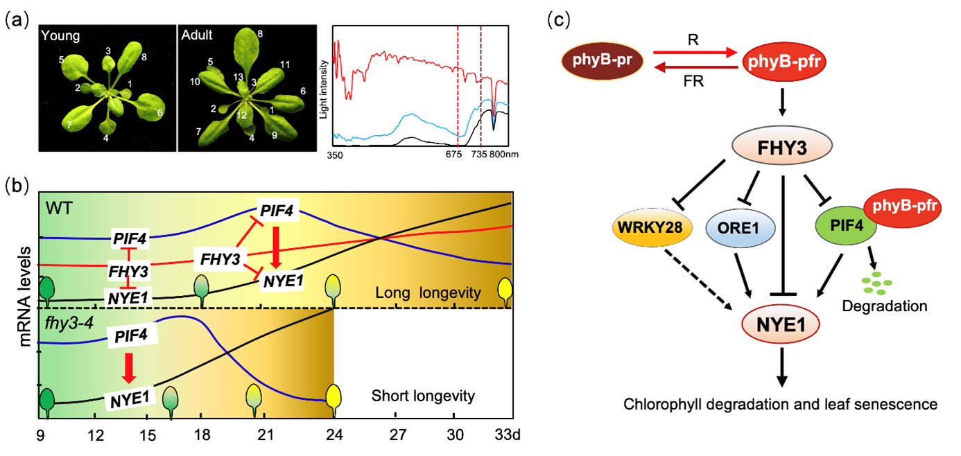 本研究發現,擬南芥FHY3功能缺失突變體的葉綠素降解加劇,壽命明顯縮短。光信號蛋白FHY3直接抑制衰老關鍵調控因子PIF4和NYE1的轉錄,且PIF4或NYE1功能缺失均可回補fhy3-4突變體的葉片提前衰老表型。同時,FHY3與PIF4競爭性結合NYE1啟動子上的G-box順式元件,進而阻止PIF4對NYE1的轉錄激活。此外,FHY3在葉片中的轉錄水平逐漸衰老進程增加,這與FHY3功能缺失加速葉綠素降解并縮短葉片壽命相一致。遺傳分析表明,PIF4作用于FHY3下游,通過影響葉綠素降解和葉片衰老來拮抗調控葉片壽命。本研究發現FHY3是葉片壽命維持和衰老調控的的關鍵因子,揭示了植物通過整合光信號和內部發育因素來監控葉片衰老和壽命的動態調節機制。