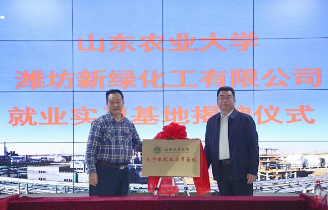 近日,山東農(nóng)業(yè)大學(xué)大學(xué)生就業(yè)實(shí)習(xí)基地簽約揭牌儀式在濰坊新綠化工有限公司舉行。學(xué)校黨委常委、副校長(zhǎng)高立明與新綠化工董事長(zhǎng)趙焱共同為基地揭牌。