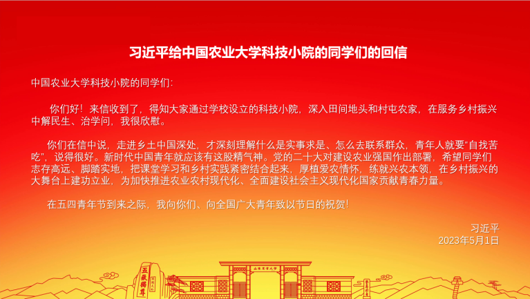 中共中央總書記、國家主席、中央軍委主席習近平近日給中國農業大學科技小院的同學們回信,在山東農業大學廣大青年學生中引起熱烈反響。在全國重點實驗室、在學校各個科技小院實驗站點、在青年學生活動場所...廣大青年學生自發組織起來認真學習、廣泛熱議回信精神,同學們紛紛表示,要牢記習近平總書記殷殷囑托,志存高遠、腳踏實地,厚植愛農情懷,練就興農本領,在服務鄉村振興戰略,推進農業農村現代化建設,全面建設社會主義現代化國家的實踐中貢獻青春力量。