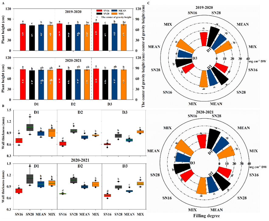 提高種植密度是小麥增產(chǎn)的主要途徑之一。然而,密植群體資源競爭加劇,莖稈發(fā)育質(zhì)量變差,倒伏風險增加。混作可以利用品種的生態(tài)多樣性解決密植小麥群體倒伏性與產(chǎn)量的矛盾。然而,混作增加密植小麥莖稈抗倒伏性是由于品種間物理支撐,還是由于群體光環(huán)境優(yōu)化,莖稈質(zhì)量改善,導(dǎo)致抗倒伏性能提高,還尚不清楚。該團隊通過設(shè)置不同種植密度和種植模式,研究混作對小麥冠層光環(huán)境、莖稈抗折力及產(chǎn)量形成的影響,闡明混作提高密植小麥莖稈抗倒伏性和產(chǎn)量的機制。