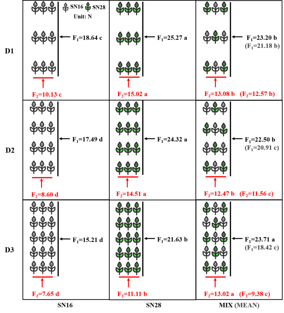 研究表明,種植密度提高至525×104株hm-2時,兩品種混作冠層光截獲率最高,小麥捕獲更多地光能用于同化物的生產(chǎn),莖稈利用充足的底物合成較多的結(jié)構(gòu)碳水化合物(纖維素、木質(zhì)素),為小麥莖稈抗折力的形成提供充足的物質(zhì)基礎(chǔ)。混作使小麥莖壁增厚并增強其剛性和彈性,群體抗倒伏能力提高,降低了小麥倒伏的風險;同時,混播顯著提升莖稈非結(jié)構(gòu)性碳水化合物(可溶性糖),為莖稈向籽粒再轉(zhuǎn)運(粒重)提供物質(zhì)基礎(chǔ),籽粒重量顯著提高。考慮到全球人口的快速增長,對糧食的需求不斷增加以及倒伏脅迫對小麥產(chǎn)量負面影響的嚴重性,增密條件下混作不失為一個提高產(chǎn)量的有效方法。