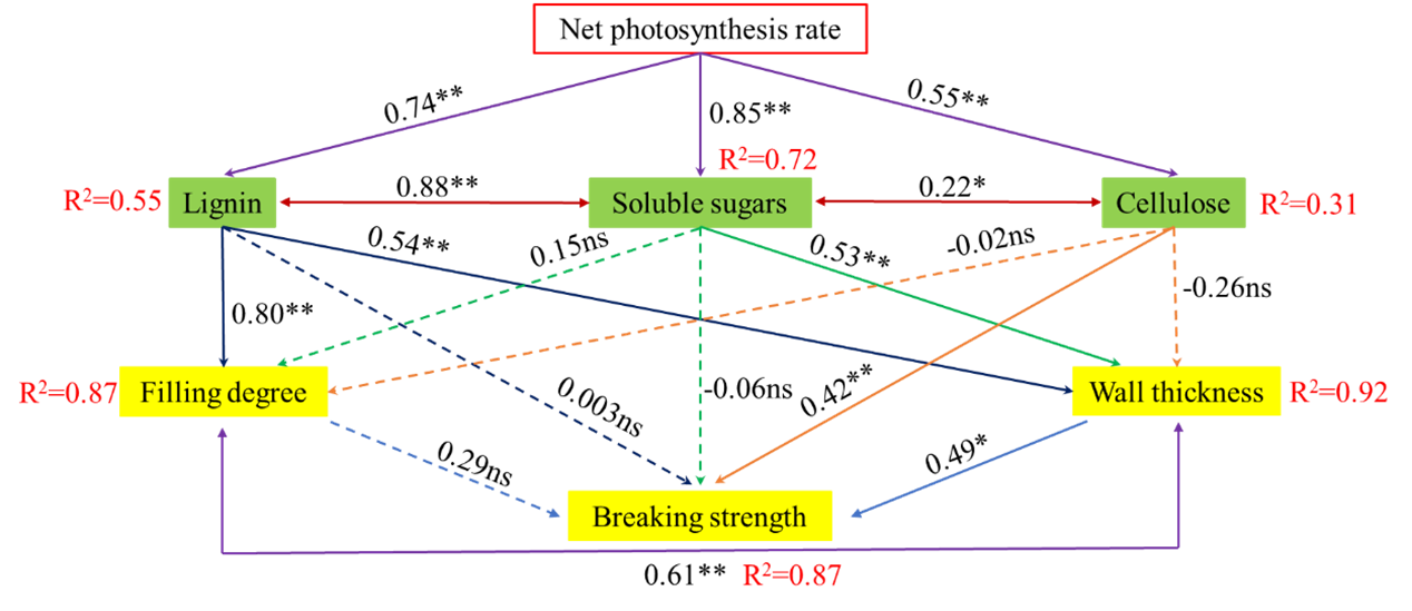 圖3 旗葉凈光合速率、莖稈化學組分和形態(tài)特征影響第二節(jié)間抗折力的結(jié)構(gòu)方程模型