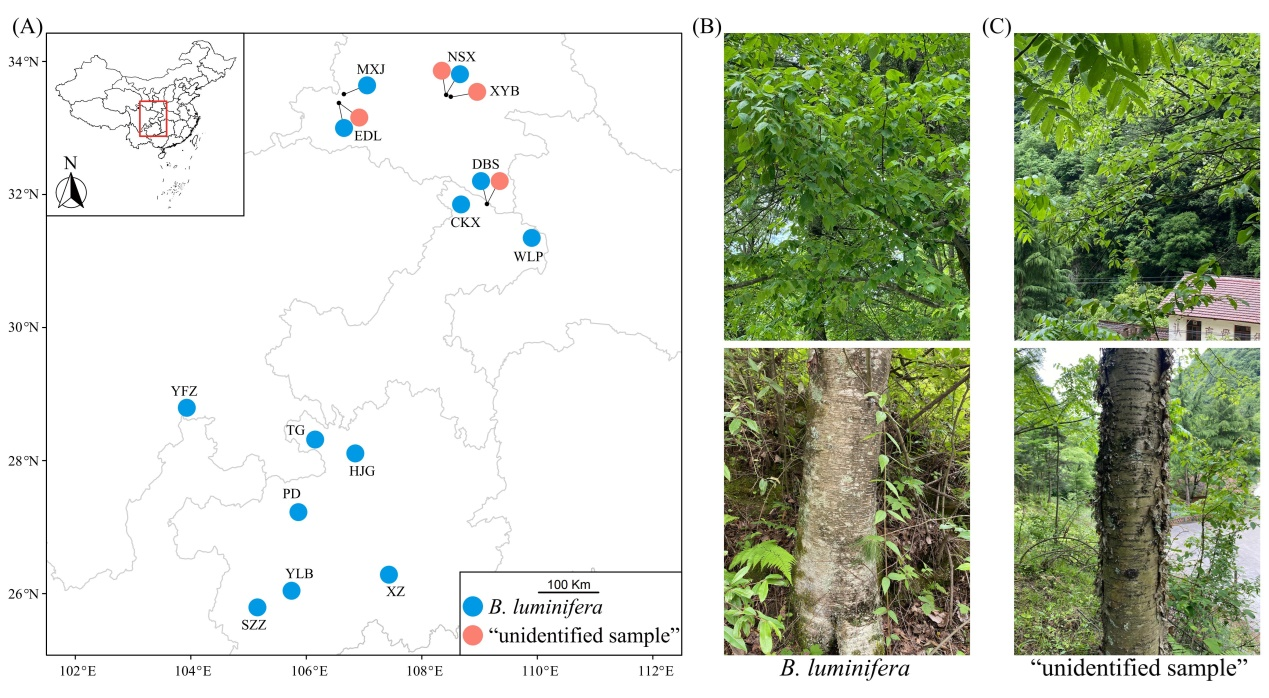 (A)采樣地點(B)亮葉樺(C)“未鑒定物種”
