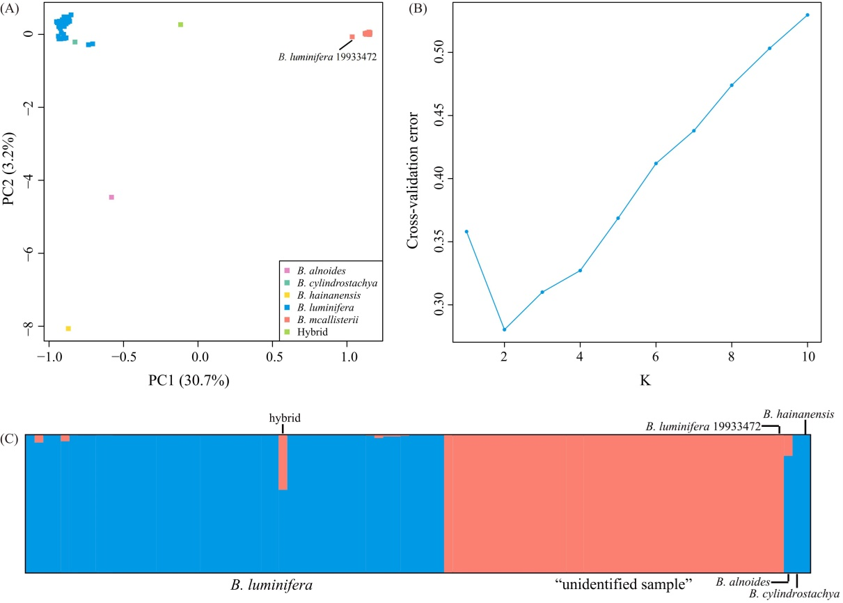 該研究對于植物分類帶來一些新的思考和啟示。第一,模式標本是物種定名的依據。但多數模式標本采集年份久遠,缺乏經緯度信息。此外,模式標本提供的花、葉子及果實形態特征有時不足以區分近緣物種。在此研究中,亮葉樺模式標本不但缺乏詳細的地理信息,而且缺乏區分亮葉樺和陜南樺的關鍵特征(如樹皮形態、倍性及皮層是否具有香味)。因此,作者建議發表新物種時,模式標本需包含區分近緣物種的關鍵信息。此外,隨著測序技術的快速發展,作者認為對以往的模式標本以及未來定名新物種的模式標本開展測序(基因組測序、重測序或高通量測序)是必要的。第二,植物園存在未被發表的物種。在本研究中,在愛丁堡皇家植物園種植的亮葉樺19933472于1993年引自我國云南省,但一直被錯誤的標記為亮葉樺。但該研究證實亮葉樺19933472和陜南樺為同一個物種。