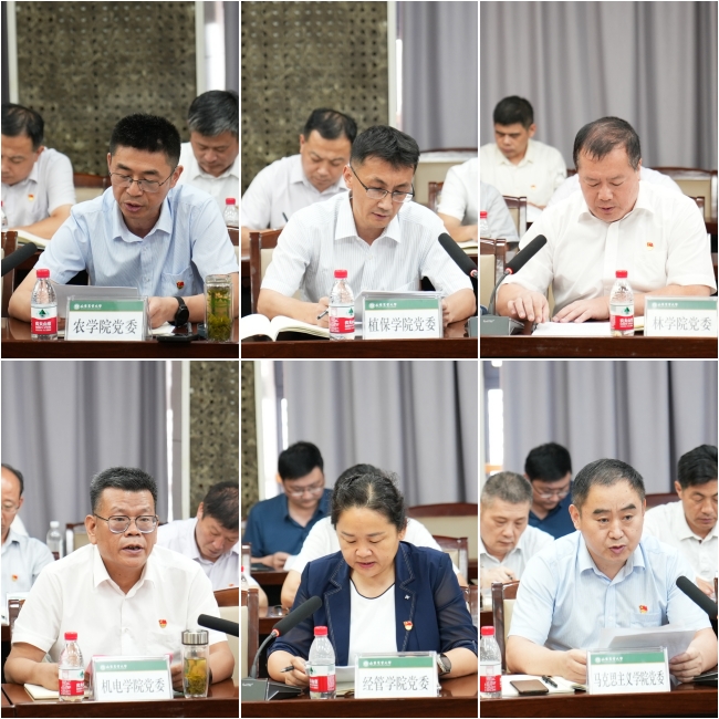 黨委常委、宣傳部部長李廣松,黨委常委、組織部部長張鐵成,各基層黨委(直屬黨總支)主要負責同志以及學校主題教育領導小組辦公室有關同志參加會議。會上,農學院、植保學院、林學院、機電學院、經管學院(商學院)、馬克思主義學院等6個學院的黨委負責同志作了交流發言。
