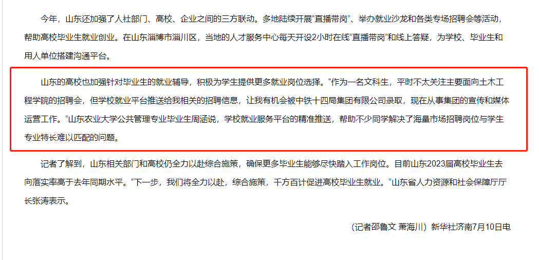 近日,新華每日電訊發表題為《加強校企聯動 擴大就業容量——山東全力拓寬畢業生就業渠道》的新聞報道,文章報道了山東通過增加招聘活動場次、擴大就業容量、拓展就業渠道等方式,努力促進高校畢業生高質量充分就業的典型做法,其中報道關注了我校就業服務平臺為畢業生提供精準推送,幫助他們解決了海量市場招聘崗位與專業特長難以匹配的問題。部分原文報道如下: