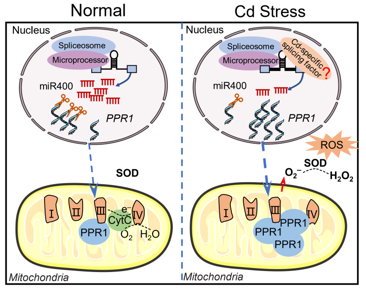 為詳細研究內含子miRNA的加工剪切過程,課題組構建并創制了能夠觀察內含子miR400剪切的含熒光素酶報告基因的遺傳材料。通過大范圍的篩選發現,重金屬鎘離子處理會特異誘導miR400的內含子發生保留,成熟miR400的產生受到抑制。過表達miR400降低了擬南芥鎘脅迫抗性,敲低miR400表達增強了擬南芥鎘脅迫抗性。進一步研究發現,這種剪切抑制miRNA的產生進一步解放了miR400的靶基因PPR1。PPR1定位于線粒體,直接影響電子傳遞鏈中的線粒體復合體III(Complex III)活性和線粒體編碼基因ccmB的RNA編輯,能夠通過維持較低的ROS水平來增強擬南芥鎘脅迫抗性。