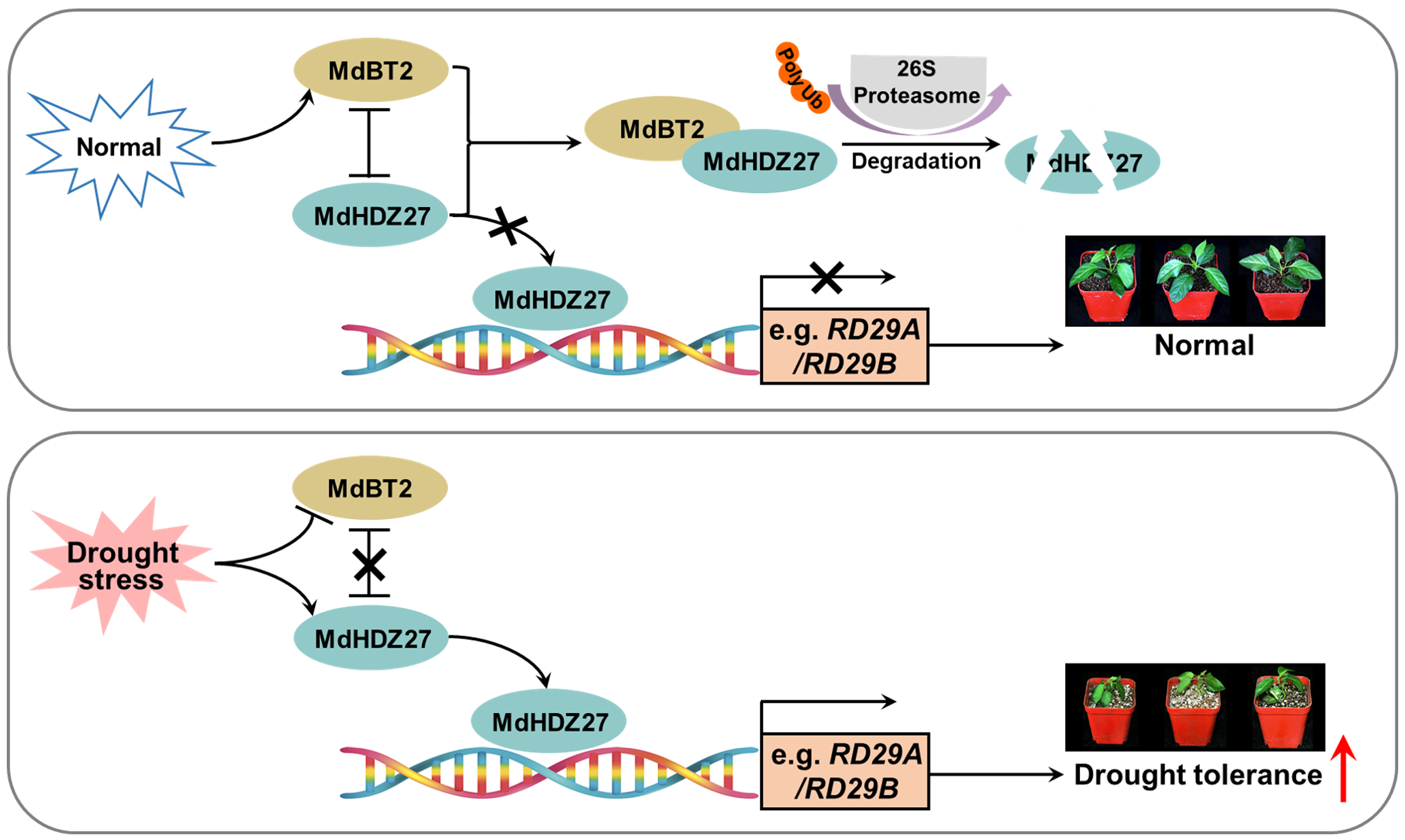 園藝科學與工程學院胡大剛-孫權團隊揭示MdBT2-MdHDZ27模塊調控蘋果耐旱性的新機制