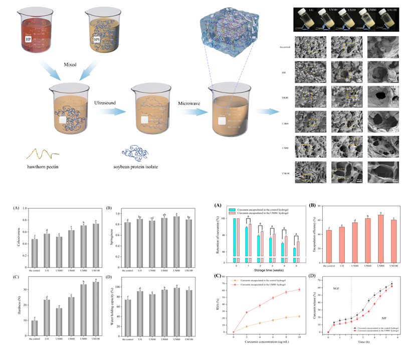 近日,食品科學與工程學院朱傳合教授團隊在《Food Chemistry》發表了題為“Ultrasonic-microwave technique promotes the physicochemical structure of hydrogel and its release characterization of curcumin in vitro”的研究論文。研究生卜愷璇為論文的第一作者,朱傳合教授和徐康副教授為共同通訊作者。