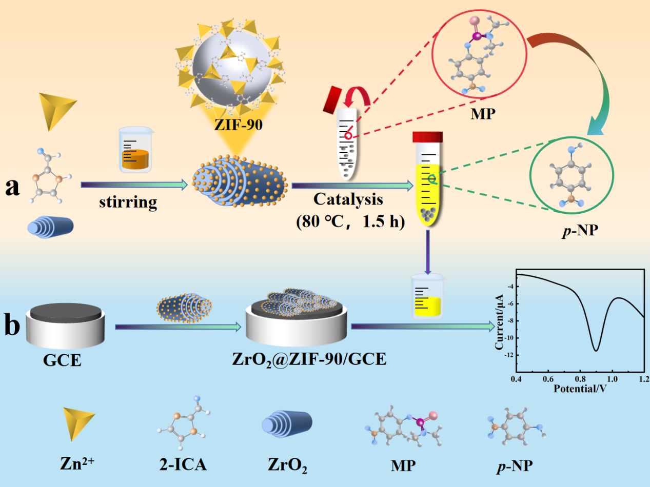 基于此,團隊研究合成了一種雙功能ZrO2@ZIF-90納米酶,用于甲基對硫磷的催化降解和電化學檢測。ZrO2@ZIF-90納米酶高效的磷酸水解酶活性可以有效地降解MP生成對硝基苯酚,同時其還具有良好電催化和信號放大性能。建立的ZrO2@ZIF-90傳感器對甲基對硫磷的檢測具有較寬的線性范圍、良好的抗干擾性和準確性。這項工作表明,雙功能納米酶在食品危害物的電化學檢測中具有廣闊的應用前景。