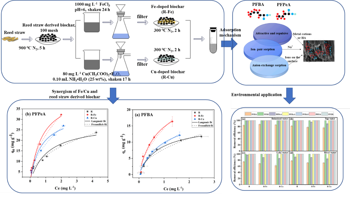 近年來,隨著對長鏈全氟化合物(PFAS)的管控,毒性相對較低的短鏈全氟化合物(C4-C6)作為替代品產生的環境風險備受關注。與長鏈PFASs相比,短鏈PFASs分子更小,親水性更強,更易在長距離內通過空氣、水等介質進行傳輸,對環境產生更加持久、廣泛的影響。目前為止,在飲用水、沉積物、污水污泥甚至極地地區的雪/冰中都被廣泛檢測到短鏈PFAS的存在,因此,迫切需要從環境中去除短鏈PFASs。生物炭作為一種具有優良成本效益的吸附劑,在水環境中長鏈PFAS去除方面表現出了較高潛力,但在短鏈PFAS吸附中存在很大弊端。本研究基于先前研究基礎,利用鐵氧化物和銅氧化物改性了蘆葦秸稈生物炭,分別對短鏈PFAS全氟丁酸(PFBA)和全氟己酸(PFPeA)的吸附量顯著提高了1.24和1.20倍,利用采用掃描電子顯微鏡、能譜分析、能譜分析、x射線光電子能譜和傅里葉紅外光譜等方法對吸附機理進行了微觀層面的探討。研究了不同環境條件下(pH、腐植酸濃度和背景電解質離子強度變化)對短鏈PFASs吸附行為的影響。在實際應用中,本研究制備的蘆葦秸稈生物炭和經Fe/Cu氧化物改性的生物炭在去除水溶液中PFBA和PFPeA以及各種天然水體介質中多種長鏈和短鏈PFASs吸附方面表現出優異的性能。
