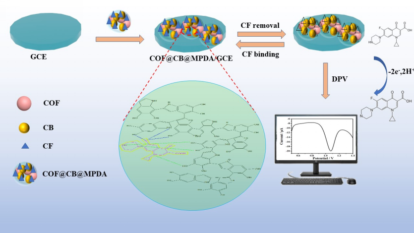 基于此,團隊以COF、CB為基體,多巴胺為功能單體,結(jié)合分子印跡技術(shù)研究合成了一種比表面積大、導(dǎo)電性能優(yōu)異且具有特異性識別作用的COF@CB@MPDA納米材料用于環(huán)丙沙星的高靈敏電化學檢測?;?a name="OLE_LINK1">COF@CB@MPDA構(gòu)建的傳感器對環(huán)丙沙星的檢測具有較寬的線性范圍、優(yōu)異的選擇性和較高的準確性。這項工作表明,COF@CB@MPDA在食品危害物的電化學檢測中具有廣闊的應(yīng)用前景。