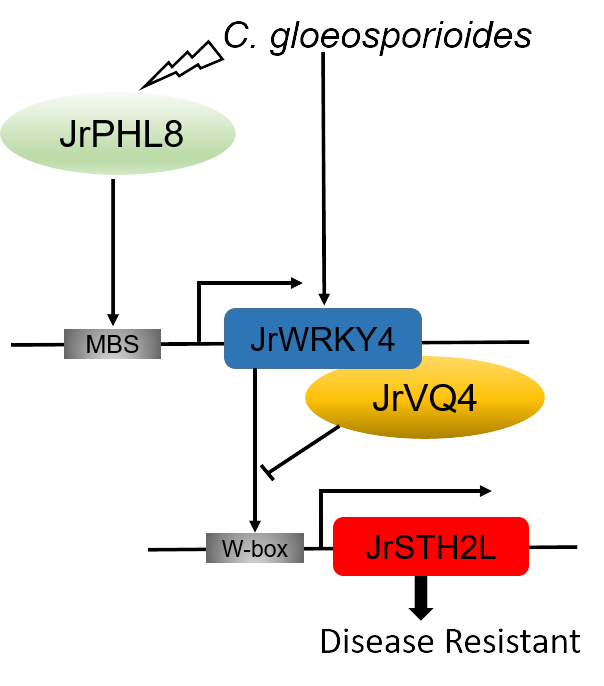 圖1. 分子模塊JrPHL8-JrWRKY4-JrSTH2L 調控核桃對炭疽病抗性