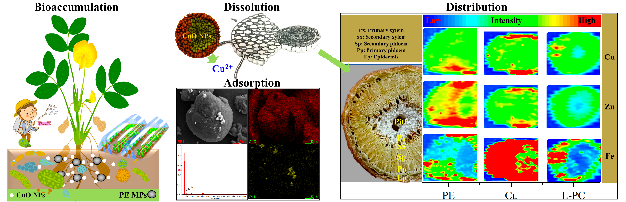 伴隨著農用化學品的廣泛應用,大量的農用化學品構成組分逐漸在農田環境積累。農藥添加劑氧化銅納米粒子(CuO NPs)和地膜主成分聚乙烯微塑料(PE MPs)作為伴隨污染物在農業生產過程中不斷在土壤環境中積累。因此,亟需開展相關污染物在土壤-花生系統中的環境行為、遷移路徑和生態毒性效應研究,以評估典型污染物土壤蓄積對花生生長的毒性風險。
