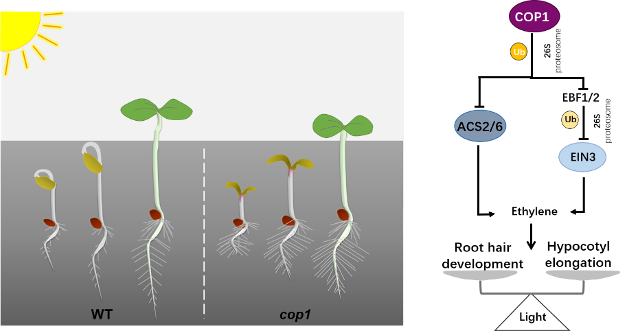 該研究首先證明COP1抑制根表皮生根毛細胞的命運決定和根毛的極性生長。此外,利用D-root系統,研究發現黑暗抑制根毛發育依賴于COP1。結合藥劑學、遺傳學和生理學分析,明確了COP1負調控乙烯的合成途徑;利用分子生物學及生物化學手段,證明COP1與乙烯合成途徑中的第一類限速酶ACS2和ACS6互作,并特異性地催化ACS2和ACS6的泛素化修飾,介導其通過26S-蛋白酶體發生降解。這一研究首次發現了Type I ACS的E3泛素連接酶。最后,通過遺傳學手段證明了ACS2及ACS6是COP1的下游組分。