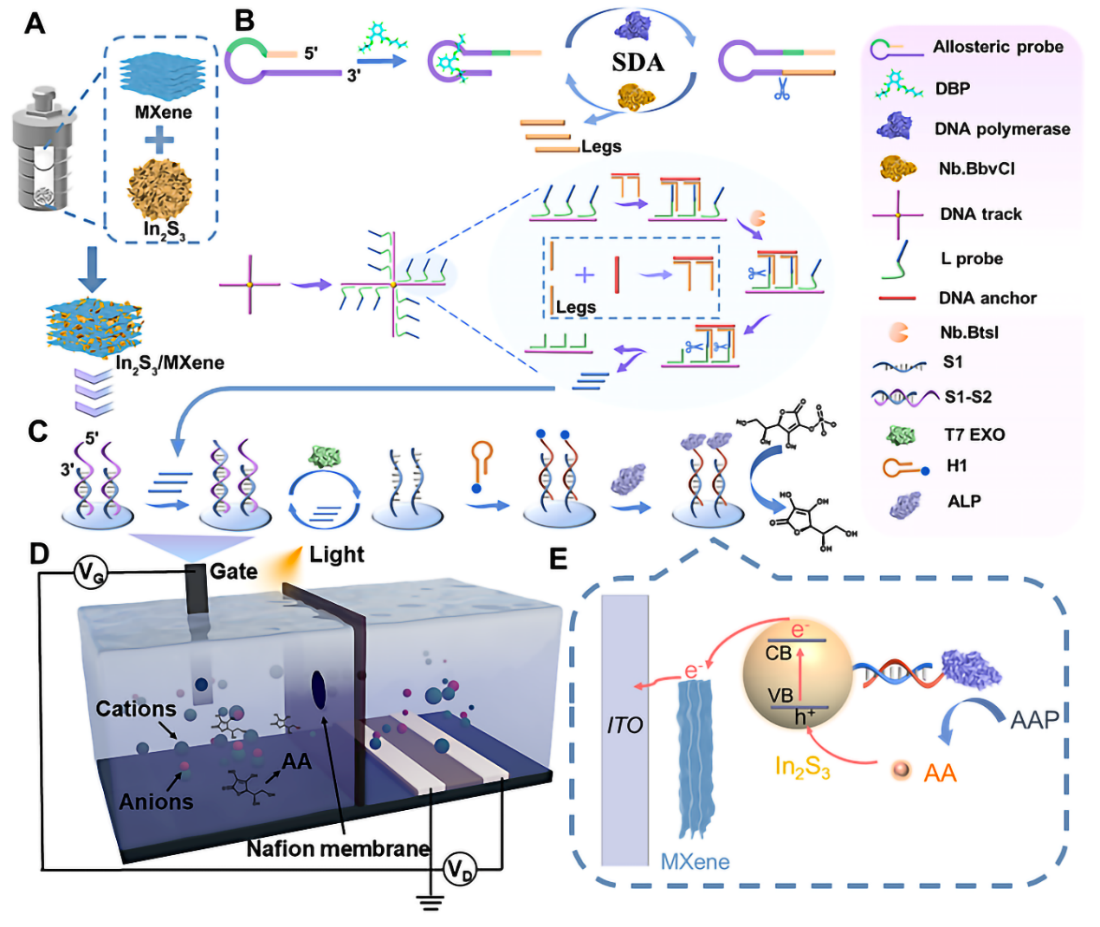 鄰苯二甲酸二丁酯(DBP)是主要的酞酸酯類塑化劑之一,因其相對廉價而被塑料生產商廣泛使用。DBP易于從塑料產品中滲出,進入空氣、水和食品等環境中,已經威脅到食品安全和人類健康。而現有的技術難以實現痕量精準檢測水或食品塑料包裝中的DBP。有機光電化學晶體管(OPECT)傳感技術因其優越的性能而成為一種先進的分析技術。因此,在這項工作中,我們開發了一種新型的靶誘導雙足DNA Walker介導的In2S3/MXene肖特基結門控OPECT適配體傳感器。DNA Walker通過適配體和靶標之間的識別被激活,然后沿著預定的軌道界面移動,實現了靶標特異性識別和信號放大檢測的整合,從而獲得了更高的檢測靈敏度和更強的檢測特異性,提供了0.18 fM的低檢測限。該技術可為水環境及食品中痕量污染物檢測提供可行的表征手段,對食品安全和人類健康具有重要意義。