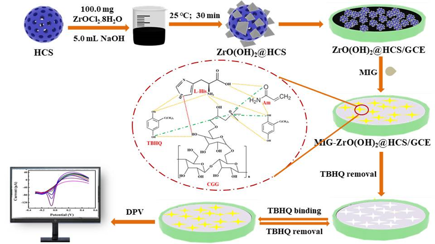 基于此,本團(tuán)隊(duì)采用L-組氨酸在室溫下通過分子間氫鍵和靜電相互作用將陽離子瓜爾膠、丙烯酰胺和TBHQ快速交聯(lián),制備了一種新型的ZrO(OH)2@HCS信號(hào)放大的分子印跡凝膠(MIG)電化學(xué)傳感器,用于高靈敏度、高選擇性地檢測(cè)TBHQ。ZrO(OH)2@HCS具有優(yōu)異的電導(dǎo)率和水分散性,被用于信號(hào)放大。在最佳條件下,MIG-ZrO(OH)2@HCS/GCE傳感器具有較好的選擇性、較寬的動(dòng)態(tài)檢測(cè)范圍和較低的檢測(cè)限。