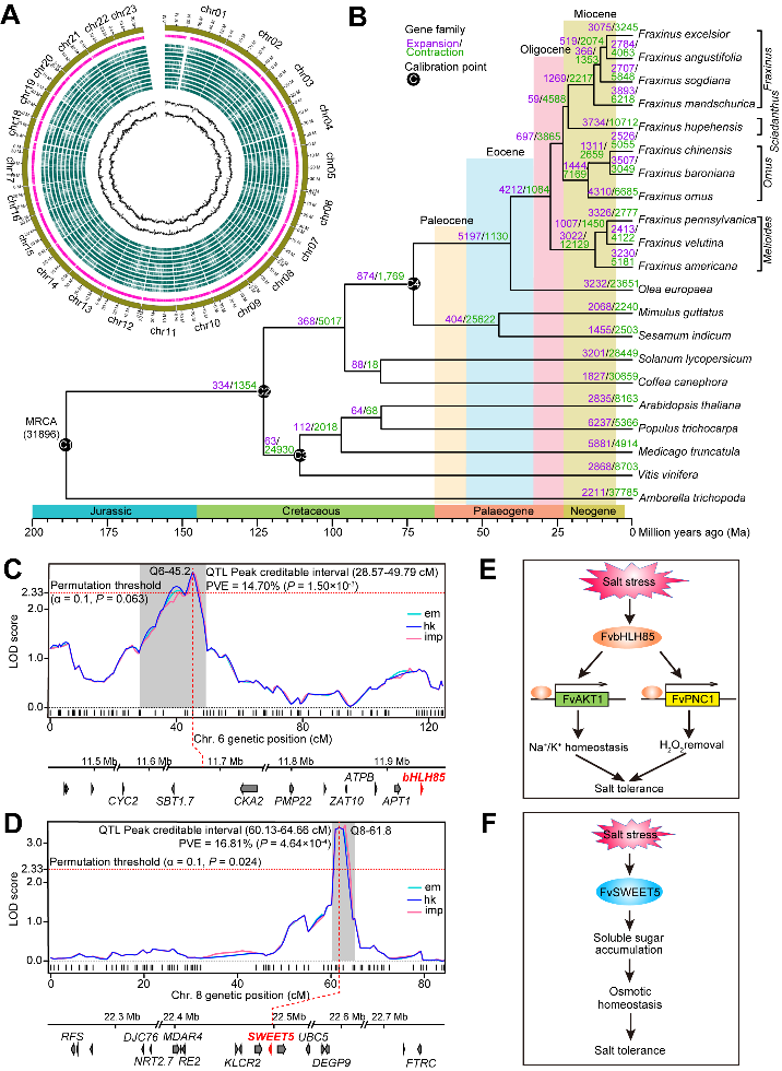 梣屬(Fraxinus)包括40多個落葉喬木或灌木樹種,廣泛分布于北半球的暖溫帶和亞熱帶地區。梣屬樹種具有豐富的遺傳多樣性和廣泛的生態環境適應性,如原產于北美洲的絨毛梣(F.velutina)和美國白梣(F. americana)引種到中國后,作為重要的耐鹽樹種用于鹽堿地造林和景觀綠化。楊克強教授團隊測序、組裝和注釋了11個梣屬樹種染色體水平級的全基因組序列,構建了梣屬物種的泛基因組圖譜,全面分析了梣屬物種的系統進化和耐鹽適應性;利用種間雜交F1群體,構建了基于存在-缺失變異(presence-absence variation)的PAV遺傳連鎖圖譜,定位了2個與耐鹽性顯著相關的PAV-QTL位點Q6-45.2和Q8-61.8,從中分別鑒定出了FvbHLH85和FvSWEET5耐鹽基因;基因功能分析表明,FvbHLH85基因介導了Na+/K+平衡和ROS穩態,FvSWEET5基因促進了可溶性糖的積累,進而增強了植株的耐鹽性。研究結果豐富了梣屬物種基因組數據,加深了對梣屬物種進化適應性的理解,挖掘分析了耐鹽基因的功能,為梣屬樹種基因組學研究和耐鹽遺傳改良奠定了基礎。