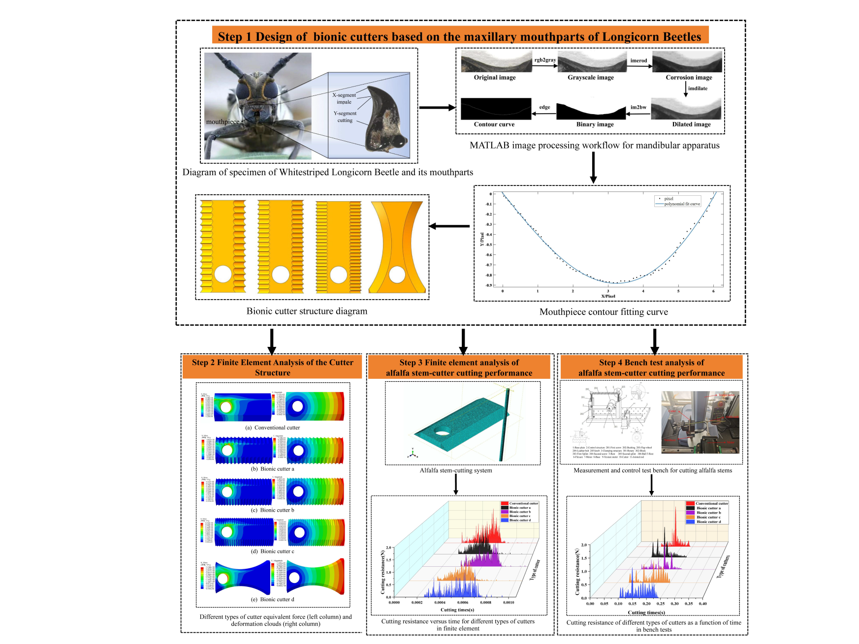 近日,機械與電子工程學院宋月鵬教授團隊在《Agriculture》上發表了題為“Study on the Bionic Design and Cutting Performance of Alfalfa Cutters Based on the Maxillary Mouthparts of Longicorn Beetles”的最新研究成果。宋月鵬教授、任龍龍博士為文章的通訊作者,機電學院碩士研究生馬靜怡為第一作者,我校為第一通訊單位。