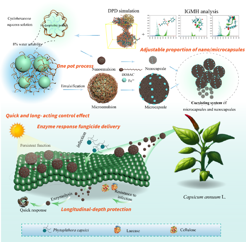 該研究以靜電力為驅(qū)動(dòng)力,木質(zhì)素磺酸鹽和烷基季銨鹽為成囊原料,開(kāi)發(fā)出一種一鍋法能夠?qū)崿F(xiàn)微/納米囊兼存的農(nóng)藥負(fù)載體系。結(jié)合實(shí)驗(yàn)表征以及IGMH分析和分子耗散動(dòng)力學(xué)模擬闡明了納米囊和微囊的形成機(jī)理,其中,微囊(2-3 μm)由木質(zhì)素磺酸鹽和烷基季銨鹽在藥劑和分散介質(zhì)形成的油水界面上靜電吸引而成,木質(zhì)素磺酸鹽與溶劑環(huán)己酮之間的弱相互作用驅(qū)動(dòng)生成的納米膠束,提供了納米級(jí)模板,形成納米囊(160-220 nm)。田間應(yīng)用時(shí),以木質(zhì)素磺酸鹽為囊殼組分的載藥微粒與致病菌侵染植物互作過(guò)程中產(chǎn)生的漆酶和纖維素酶具有響應(yīng)特性,導(dǎo)致負(fù)載活性成分加速釋放,微、納米顆粒在葉面內(nèi)外各司其職,實(shí)現(xiàn)了對(duì)辣椒疫霉病快速且持續(xù)的控制。