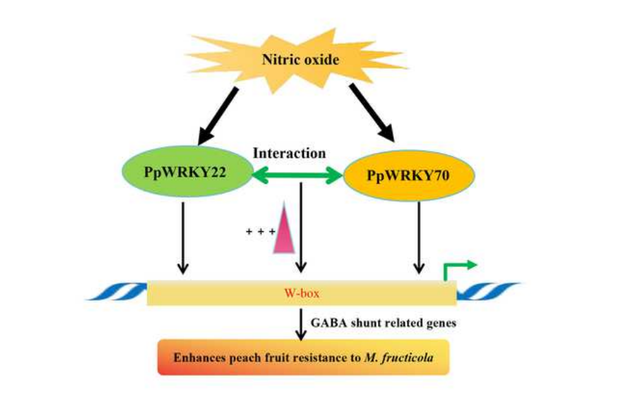 桃果實含有豐富的膳食纖維、蛋白質和維生素,深受廣大消費者的喜愛。桃果實收獲于高溫多雨季節,采后易受病原菌侵染,其中由鏈核盤菌引起的褐腐病是導致桃果實采后腐爛的主要原因之一,嚴重影響桃果實品質及商品價值。我們之前的研究表明,一氧化氮(Nitric oxide, NO)處理通過激活γ-氨基丁酸(γ-aminobutyrate, GABA)分支顯著抑制桃果實褐腐病。其中轉錄因子在調節GABA分支相關基因的轉錄中發揮著關鍵作用。然而在桃果實防御真菌病原體感染的過程中,轉錄因子介導GABA分流的轉錄調控仍在很大程度上未知。