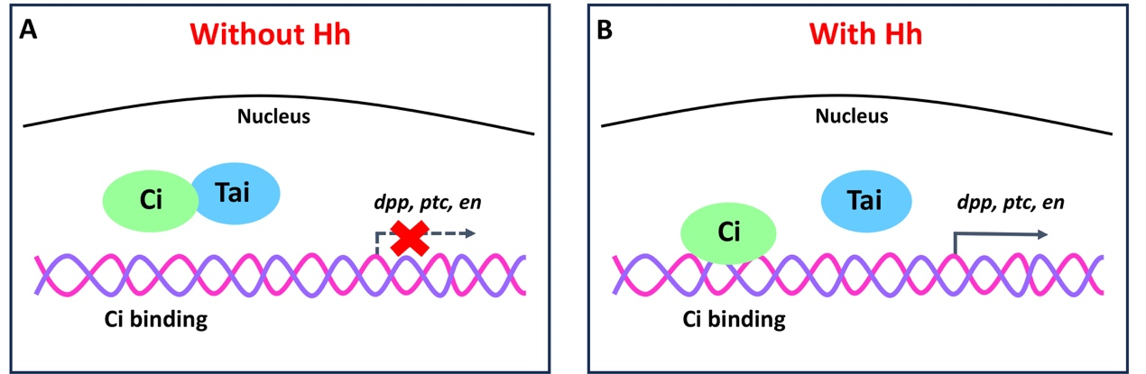 Hh信號通路主要通過調節轉錄因子Ci的出核/入核和穩定性,調控下游靶基因表達。當Hh信號失活時,Ci被錨定在細胞質的微管上,并被PKA、CK1、GSK3等蛋白激酶磷酸化,進而被泛素連接酶Slimb-Cul1泛素化降解。當Hh信號激活時,Ci蛋白則轉移至細胞核,與轉錄輔助因子CBP結合,激活靶基因表達。但是,進入細胞核Ci的活性如何調節,并不清楚。2024年11月12日,PNAS在線發表了山東農業大學生科院周紫章團隊完成的研究論文“Tai/NCOA2 suppresses the Hedgehog pathway by directly targeting the transcription factor Ci/GLI”。該論文發現,輕微激活Hh通路(過表達膜受體Smo),并不能顯著上調靶基因表達,且翅脈正常,暗示入核的Ci活性受到限制。經過遺傳篩選,作者鑒定到轉錄因子Taiman (Tai)顯著抑制Ci靶基因表達,并挽救Hh激活導致的翅脈紊亂。Tai作為昆蟲蛻皮激素和保幼激素通路的重要轉錄因子,但其對Hh通路的調控并不通過經典的激素通路。通過體細胞克隆技術,作者發現Tai僅抑制Hh信號的轉導,并不影響Hh蛋白的分泌。遺傳學互補實驗結果顯示,Tai直接抑制Ci轉錄活性。大量生化實驗結果表明,Tai與Ci存在直接相互結合,并且結合在Ci的DNA結合結構域(DBD)。Tai結合在Ci-DBD,降低了Ci與DNA的親和力,抑制靶基因的轉錄。作者還借助轉錄組測序,發現Tai對Ci的抑制效應具有廣譜性,對大部分Ci上調的基因均呈現抑制作用。