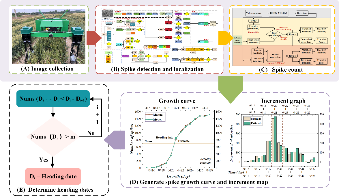 在大群體中高效、高通量、無損的動態監測作物性狀已成為連接基因型與表型的育種瓶頸。小麥育種中,抽穗期的變化可以表明小麥品種對環境變異和遺傳因素的反應,對其進行動態跟蹤有助于產量預測,識別遺傳改良所需性狀,有助于識別適應性強的基因型和最佳抽穗特性,指導制定有效的育種策略。傳統的方法往往需要定期觀察,無法實時捕捉抽穗期的動態變化,勞動強度大、效率低。因此,該研究基于DDEW-YOLOv7模型和BotSort算法提出了田間育種小麥品種抽穗期實時監測方法(圖1)。