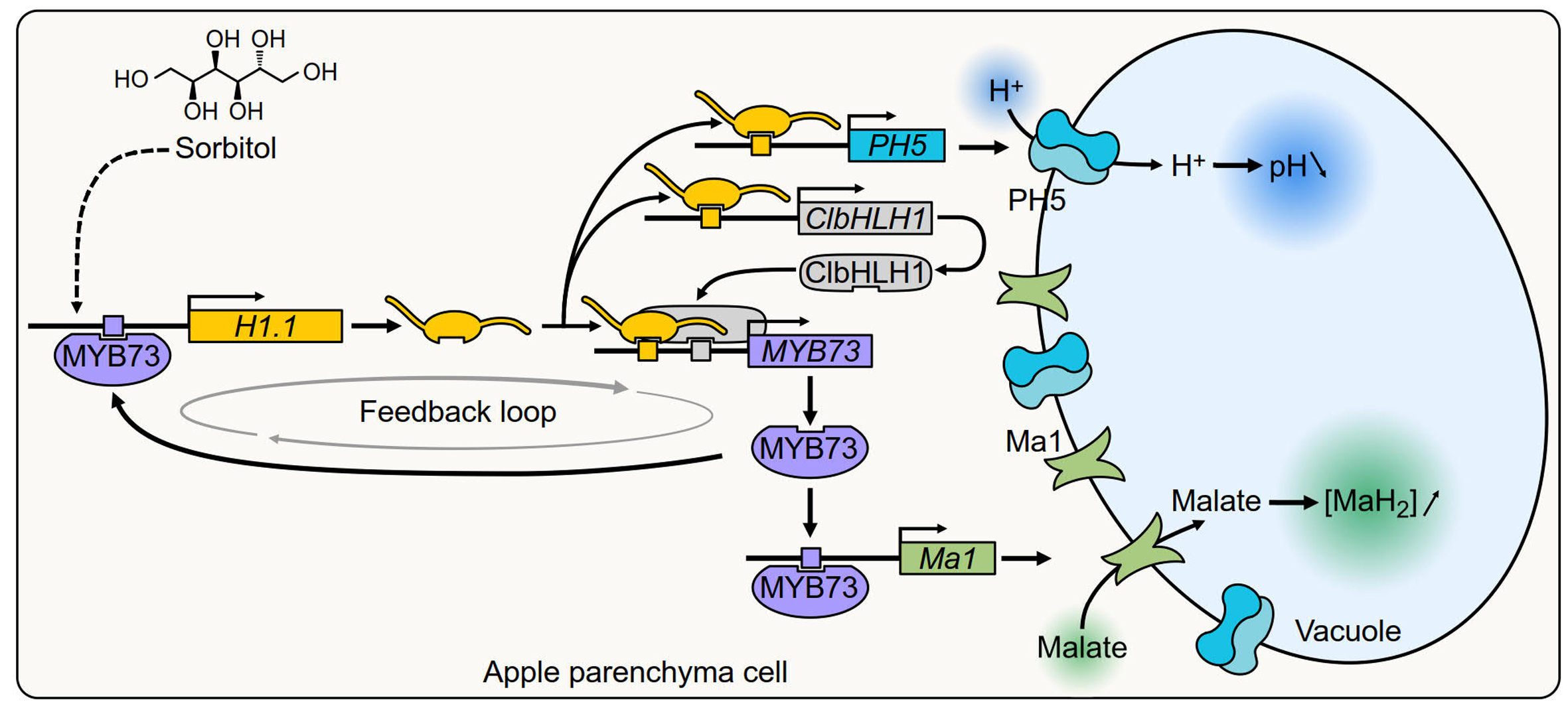本研究發現,山梨糖醇合成減少的6-磷酸醛糖還原酶(Aldose-6-phosphate reductase, A6PR)反義株系果實中蘋果酸的含量降低;qRT-PCR分析表明,在A6PR反義株系果實中,許多與蘋果酸相關基因的表達下調,這些基因涉及負責蘋果酸運輸的基因,如鋁離子激活的蘋果酸轉運蛋白MdALMT9 (Ma1),P型ATP酶MdPH5;MYB轉錄因子MdMYB73和新型翼螺旋DNA結合功能的Linker Histone MdH1.1等。山梨醇飼喂試驗表明,MdH1.1、MdMYB73和Ma1三個基因對果實中山梨醇介導的蘋果酸積累至關重要。生化分析顯示,MdH1.1直接結合MdMYB73、MdCIbHLH1和MdPH5這三個基因的啟動子,激活它們的表達。同時,MdMYB73反過來直接與MdH1.1基因啟動子結合正向調控其表達。因此,MdH1.1與MdMYB73形成正反饋回路,促進蘋果酸的積累。最后,在蘋果果實中進行的一系列轉基因功能分析表明,MdH1.1與MdMYB73協同調控山梨醇介導的蘋果酸積累。綜上所述,這些發現為MdH1.1調節蘋果酸積累的機制提供了新的見解。蘋果酸的積累是通過響應山梨醇信號,MdMYB73激活反饋回路而發生的。