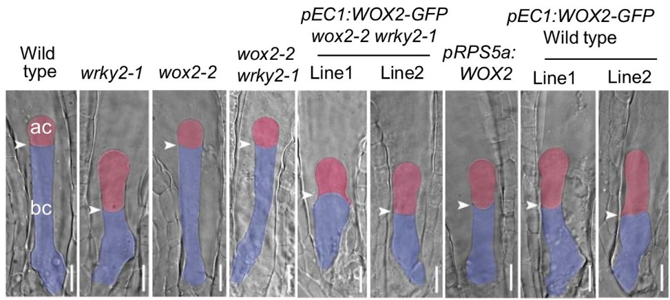 在植物胚胎發育過程中,合子的極性建立和不對稱分裂是植物體軸形態建立的基礎。在模式植物擬南芥中,合子通過一次不對稱分裂產生一個較小的頂端細胞和一個較大的基底細胞。頂端細胞隨后發育成胚胎的主體,而基底細胞則發育成為胚柄。這兩者共同構成了植物的頂-基體軸;合子極性的異常會直接影響頂基軸的建立,從而導致進一步的發育缺陷。先前的研究表明,擬南芥合子極性的建立是由絲裂原活化激酶 (Mitogen-activated protein kinase, MAPK) 級聯YODA-MKK4/5-MPK3/6信號通路所控制的。在此通路中,MPK3/6通過磷酸化核心轉錄因子WRKY2,直接激活WOX8的表達,進而調控了合子的極性建立及隨后的胚胎發育過程。但在wkry2突變體中過量表達WOX8 并不能完全恢復 wrky2 突變體的合子表型,暗示可能還有參與此過程的其他成員尚未被發現。因此解析 WRKY2 下游的分子調控網絡,對于深入理解合子極性建立具有重要意義。