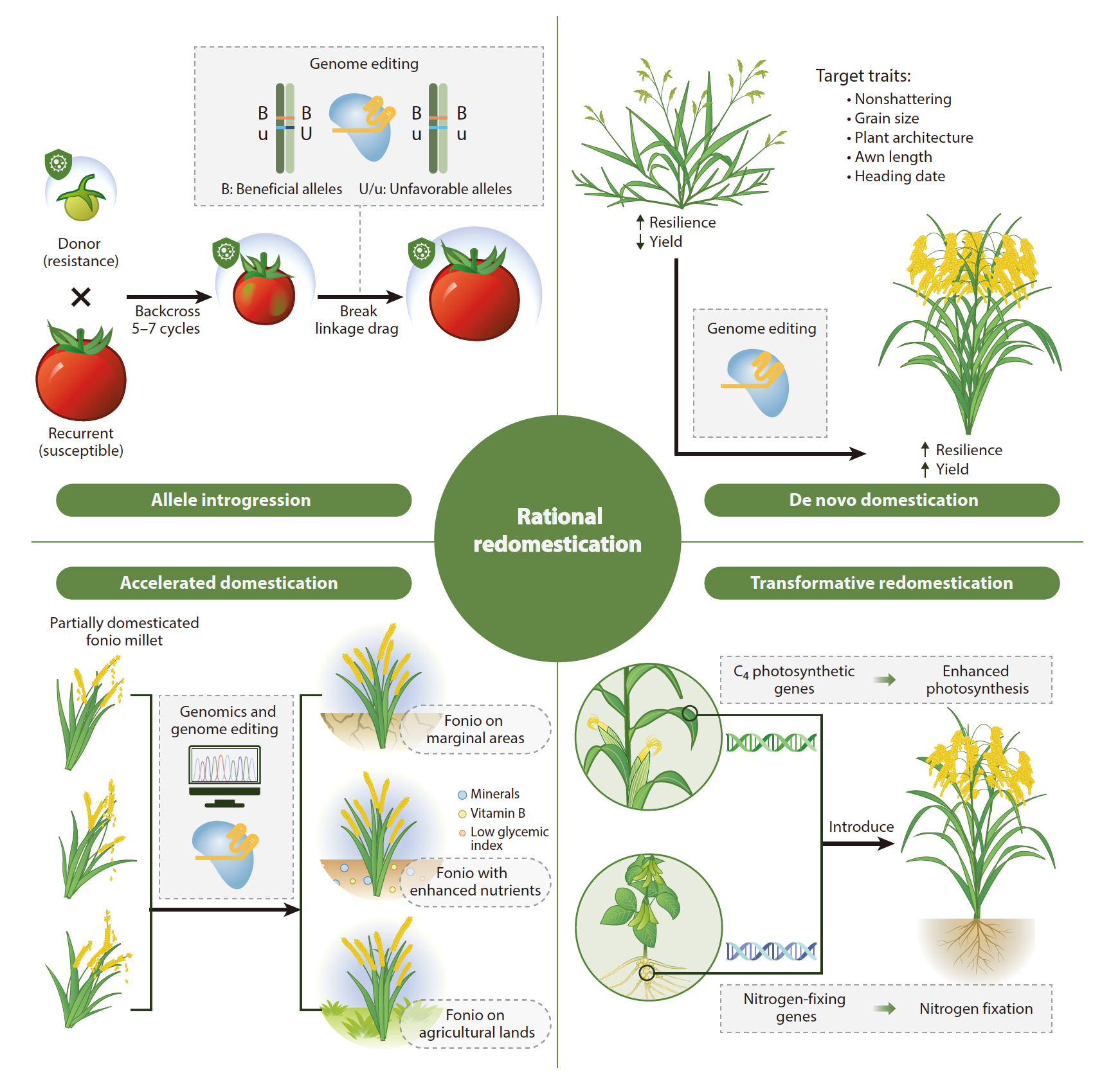 -外源遺傳組分的引入將在理性再馴化中帶來變革性突破,推動作物育種向更高效、更精準的方向發展。