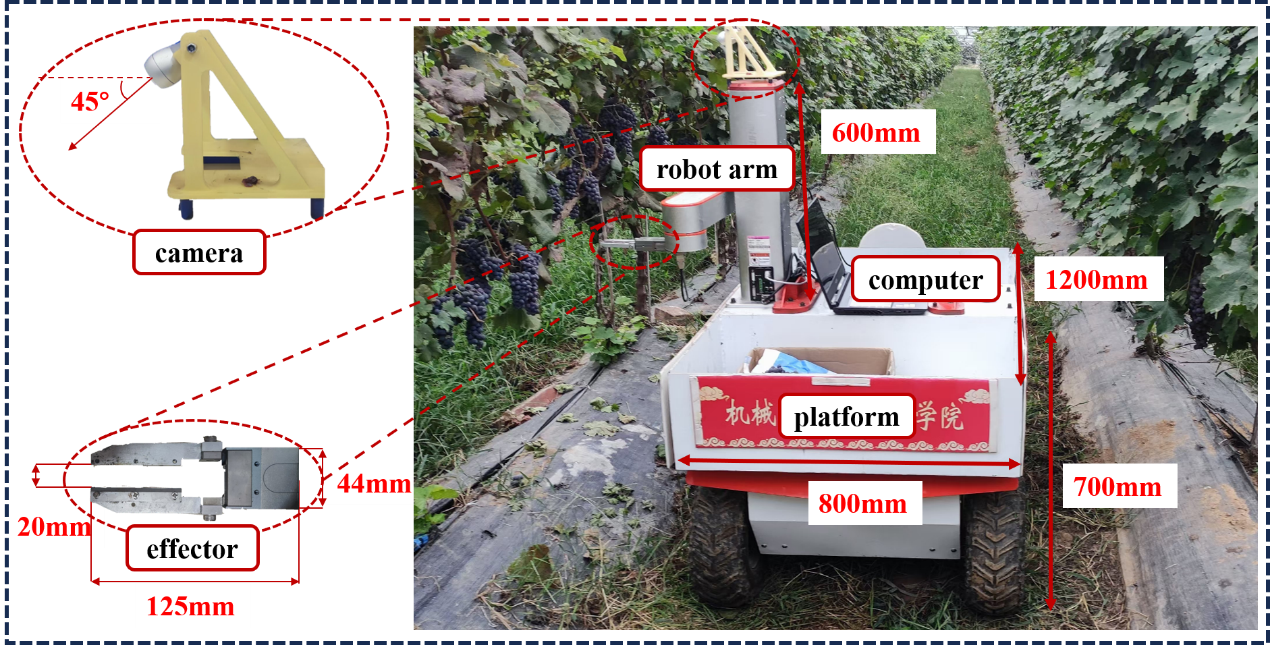 鮮食葡萄的機械化、自動化采收是降低鮮食葡萄生產成本,提高生產效率的有效途徑,而傳統的人工采摘葡萄存在勞動強度大、效率低等問題,嚴重制約著鮮食葡萄生產的機械化與自動化,針對鮮食葡萄采摘機械化與自動化的生產需求,基于鮮食葡萄采摘機器人提出一種You Only Look Once version 8 nano-Deformable Convolutional Networks-Wise Intersection over Union-Fourth Detection Layer(YOLO v8n-DWF)網絡模型(如圖1),設計了鮮食葡萄采摘點定位方法,實現了鮮食葡萄采摘點的快速識別與準確定位。針對自然環境中低質量數據集以及小目標難檢測等問題,基于YOLOv8網絡模型,融合變形卷積網絡(DCN)模型、Wise-Intersection over Union version 3 (WIou v3)損失函數以及小目標檢測層,提出了YOLOv8-DWF網絡模型,試驗結果表明提出的YOLOv8n-DWF模型的檢測精度(Precision,P)、召回率(Recall,R)、平均精度均值(mean Average Precision,mAP)分別為97.9%、95.3%和97.6%,將其應用于鮮食葡萄采摘機器人(圖2),平均采摘成功率為87.40%,實現了鮮食葡萄的自動采摘,為鮮食葡萄的智機械化、自動化采摘提供了堅實的理論基礎。