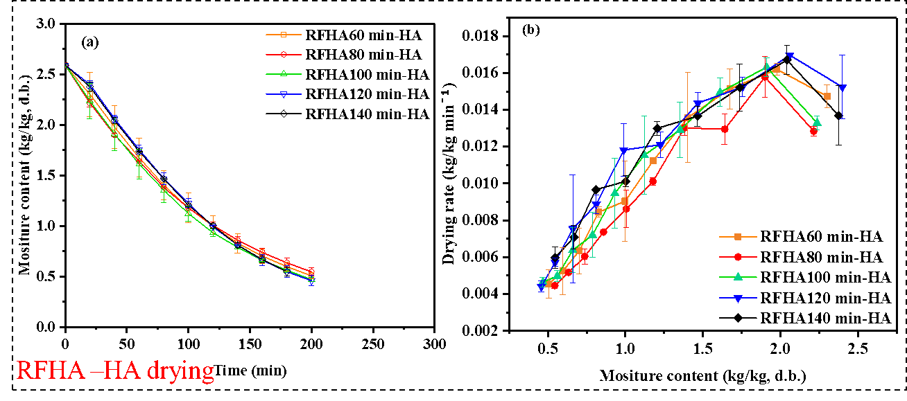 質地柔軟、味道甜美的紅薯果脯深受消費者歡迎。熟化后的甘薯果脯對人體有更多益處。射頻結合烤箱(RF-O)烘烤被認為是一種高效的紅薯熟化方法,時間短,產品質量好。RF-O預處理后,RFHA的趨勢與RFHA-HA干燥對樣品的趨勢相似。與HA干燥(210 min)相比,RFHA干燥(180 min)和RFHA-HA干燥(200 min)在干燥時間上顯示出較小的優勢。三種干燥處理后的樣品具有相近顏色(?E值9.81–11.12)、質地(硬度值2360.67-3345.07 gf)和可溶性固形物含量(20.72%-21.81%)的優質紅薯果脯。因此,RF-O熟化可以作為紅薯干燥前的短時預處理,為食品工業的干燥過程提供指導。