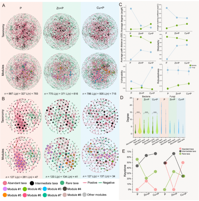 近日,生命科學學院高崢教授和周波教授團隊在期刊《Ecotoxicology and Environmental Safety》發表了題為“Exposure to thiazole pesticides disrupts pathogens and undermines keystone status of rare taxa within bacterial ecological networks”的研究論文。文章系統探究了土壤微生物稀有類群對噻唑類農藥的響應模式,結果顯示農藥暴露削弱了稀有類群在微生物分子生態網絡中關鍵物種(keystone)節點的占比,對農業生態系統的穩定性造成潛在風險。