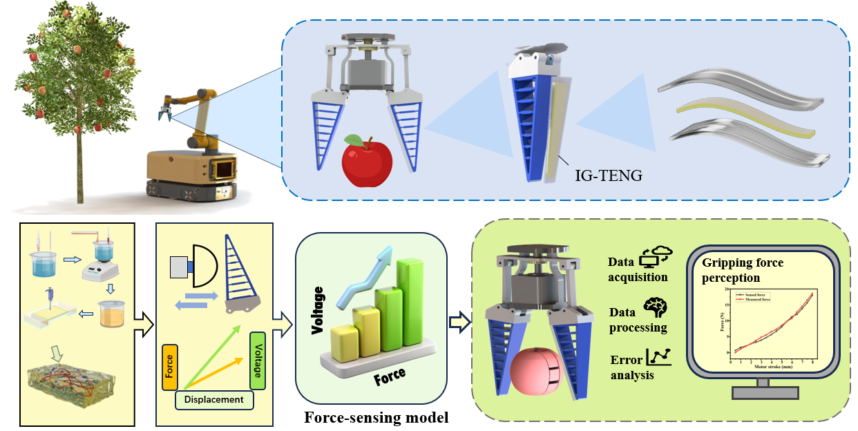 針對(duì)以上技術(shù)難題,研究團(tuán)隊(duì)制備了一種基于摩擦納米發(fā)電機(jī)的柔性自驅(qū)動(dòng)力感知傳感器(IG-TENG),并成功應(yīng)用于新鮮果蔬的無(wú)損采摘。實(shí)驗(yàn)結(jié)果表明,IG-TENG 具有卓越的可拉伸性、良好的電輸出性能以及長(zhǎng)期工作穩(wěn)定性。在0-20 N內(nèi)表現(xiàn)出高靈敏度(3.53 V/N)、良好的線性度(R2= 0.989)以及對(duì)不同抓取位姿的良好適應(yīng)性,力感知準(zhǔn)確率高達(dá) 93.77%。此外,該傳感器憑借制造工藝簡(jiǎn)單、可擴(kuò)展,成本低、無(wú)污染和自供電等優(yōu)勢(shì),在柔性電子、智能機(jī)器人、農(nóng)業(yè)采摘及可穿戴設(shè)備等領(lǐng)域展現(xiàn)出廣闊的應(yīng)用前景。