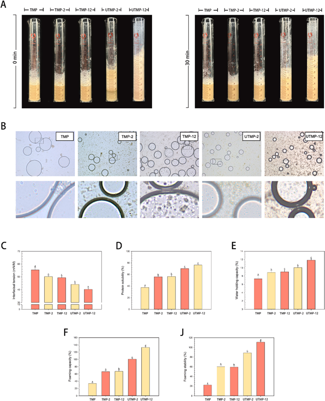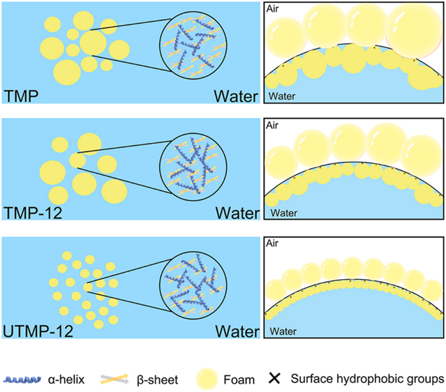 為改善TMP的起泡性能,本研究采用了極端pH值調(diào)節(jié)聯(lián)合高強(qiáng)度超聲(High-Intensity Ultrasound, HIUS)處理的方式對(duì)其進(jìn)行改性。研究結(jié)果表明,在強(qiáng)堿性條件下,TMP對(duì)HIUS的響應(yīng)更為顯著。在該條件下,蛋白質(zhì)分子發(fā)生解折疊,超聲產(chǎn)生的空化效應(yīng)破壞了大量非共價(jià)鍵,導(dǎo)致大量可溶性聚集體解離,從而減少了蛋白質(zhì)粒徑,暴露出疏水基團(tuán),提高了表面疏水性,并增加了游離巰基含量。此外,改性處理還改變了TMP的二級(jí)和三級(jí)結(jié)構(gòu):α-螺旋含量增加,而β-轉(zhuǎn)角和β-折疊含量減少。這些結(jié)構(gòu)變化提升了蛋白質(zhì)在水-空氣界面的界面性能,使得改性后的蛋白(UTMP-12)表現(xiàn)出優(yōu)異的起泡性能。本研究為TMP在充氣食品中的應(yīng)用提供了一種新的思路和方法。