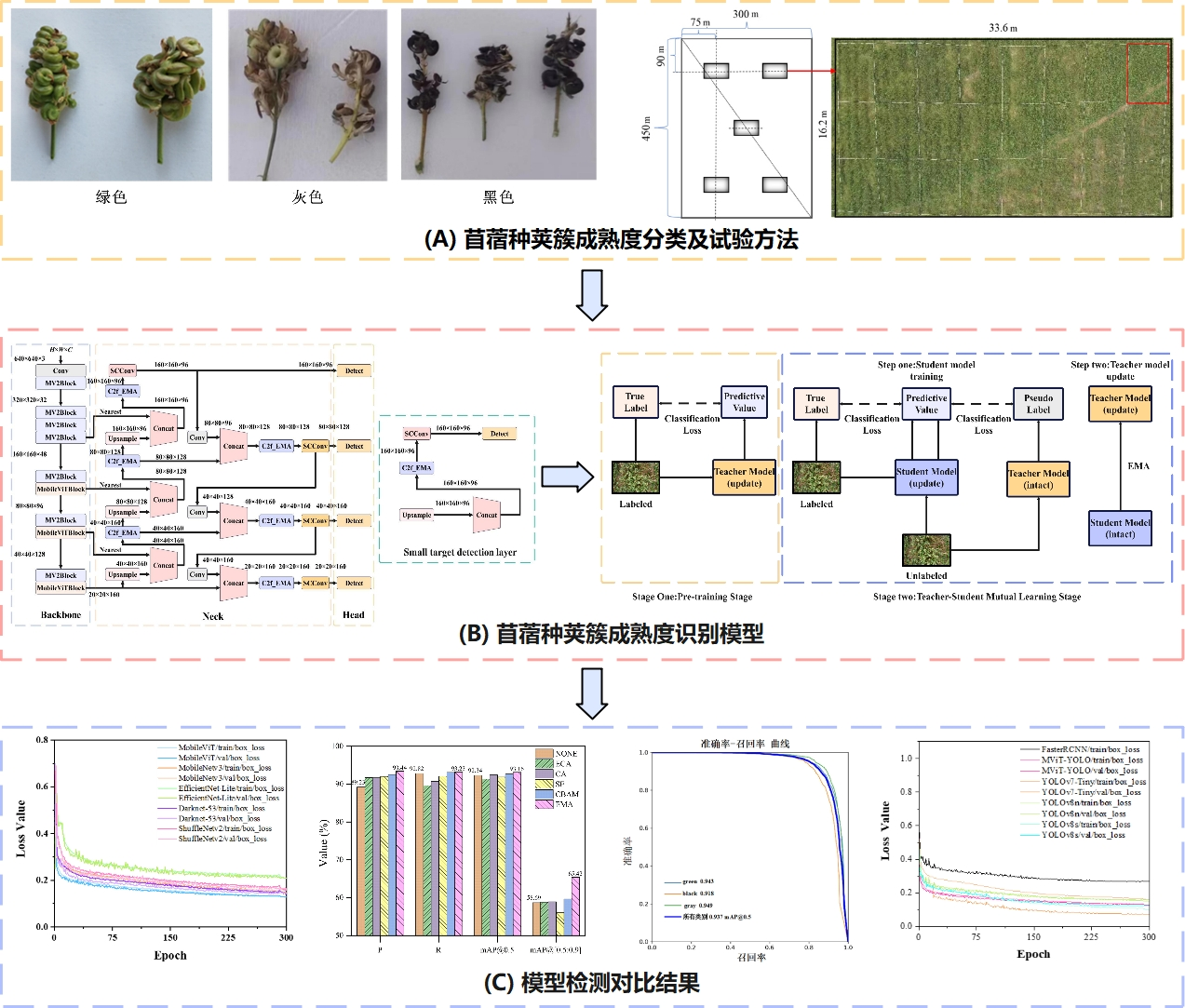 針對以上技術(shù)難題,團(tuán)隊(duì)提出了一種基于無人機(jī)和半監(jiān)督深度學(xué)習(xí)模型SSOD-MViT的苜蓿種莢簇成熟度識(shí)別方法(圖1)。該模型采用改進(jìn)的輕量級通用視覺轉(zhuǎn)換器MobileViT作為骨干,在頸部網(wǎng)絡(luò)中增加一個(gè)小目標(biāo)檢測層,在推理過程中融合SAHI算法,提高小尺寸苜蓿種莢簇的檢測精度,增強(qiáng)模型的抗干擾能力。試驗(yàn)結(jié)果表明,SSOD-MViT的mAP@0.5達(dá)到92.23%,平均檢測時(shí)間為82.34 ms。該研究成果可以有效改善現(xiàn)有模型在大田復(fù)雜環(huán)境下苜蓿種莢簇成熟度的檢測效果,為苜蓿種子生產(chǎn)行業(yè)生產(chǎn)效率的提高和生產(chǎn)成本的降低提供技術(shù)支持。