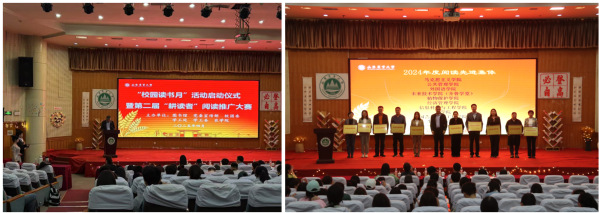 4月22日,學校舉辦2025年“校園讀書月”活動啟動儀式暨第二屆“耕讀者”閱讀推廣大賽。黨委常委、副校長周玉璽出席活動并講話。啟動儀式同時表彰了2024年度“閱讀先進集體”和“大學生閱讀之星”。經過評選,馬克思主義學院等10個單位獲“閱讀先進集體”榮譽稱號,劉軍訓等30名同學獲“大學生閱讀之星”榮譽稱號。