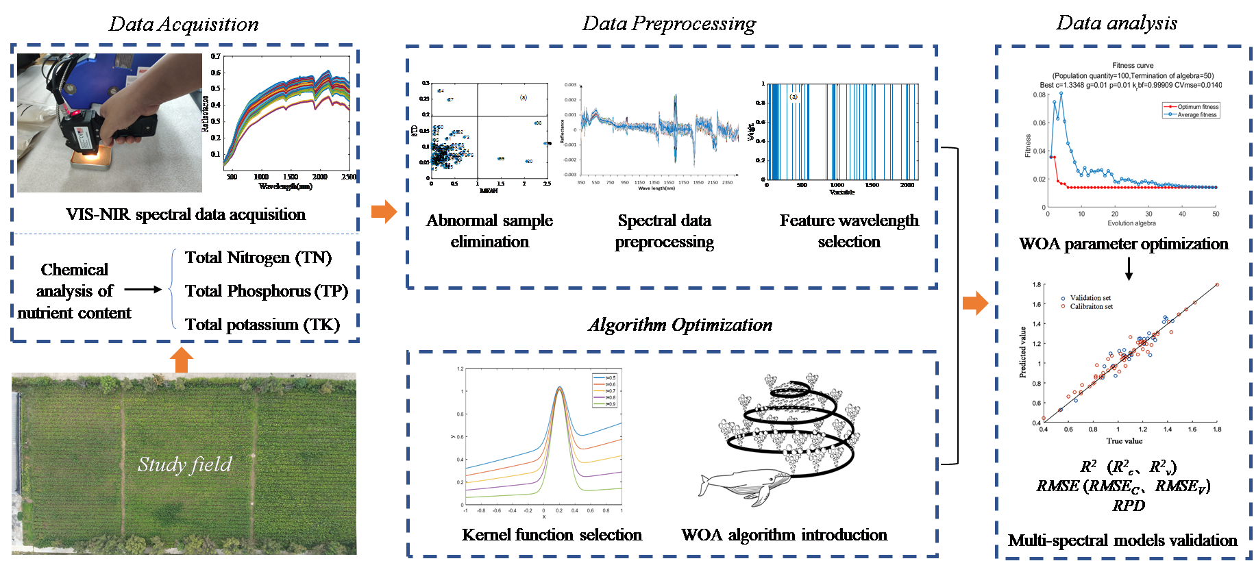 針對以上技術難題,研究團隊采用可見-近紅外光譜(Vis-NIR,350–2500 nm)檢測手段,開發一種基于機器學習算法的快速、低成本、高精度的土壤營養成分檢測方法,特別針對總氮(TN)、總磷(TP)和總鉀(TK)的精準測定,助力現代化精準農業的發展。具體的,本研究采用融合徑向基核函數(RBF)與多項式核函數(Poly)的RBF-Poly混合核函數,聯合支持向量機(SVM)定量預測算法,構建土壤中總氮、總磷、總鉀等養分的定量預測模型。引入鯨魚優化算法(WOA)優化模型中g(核函數參數)、c(懲罰因子)和γ(權重系數)參數,優化模型預測結果。研究結果表明,對于TN、TP和TK的最優模型驗證集預測結果分別為0.902、0.937和0.904,模型剩余預測偏差分別達到3.206、3.939和2.608,為準確、無損檢測土壤養分提供了穩定可靠的預測模型。該研究成果在農業與環境管理實踐中具有重要應用價值,有助于實現更高效、更準確的土壤養分監測與管理。