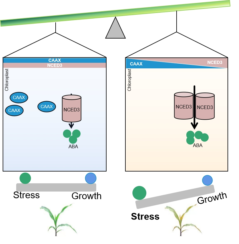 研究團(tuán)隊(duì)首先通過精細(xì)定位和RNA-seq技術(shù)確定了ZmCAAX是葉黃突變體yp1的候選基因。轉(zhuǎn)錄組結(jié)果顯示ZmCAAX突變影響了類胡蘿卜素的降解和ABA的生物合成。進(jìn)一步研究發(fā)現(xiàn)ZmCAAX與ABA合成酶ZmNCED3相互作用調(diào)并影響其蛋白穩(wěn)定性,本研究在玉米中首次鑒定到了ZmNCED3的上游調(diào)控因子,并解析了ZmCAAX參與調(diào)控ZmNCED3降解的分子機(jī)制。對(duì)葉綠體蛋白降解與環(huán)境脅迫之間的關(guān)系提供了理論基礎(chǔ)。通過基因編輯ZmCAAX基因或選擇ZmCAAX的自然變異等位基因,可以顯著提高植物的抗旱能力和總類胡蘿卜素含量。為玉米在干旱脅迫下實(shí)現(xiàn)資源優(yōu)化分配提供了新思路。通過靶向調(diào)控ZmCAAX的表達(dá),有望在籽粒營(yíng)養(yǎng)品質(zhì)提升與抗旱育種之間實(shí)現(xiàn)精準(zhǔn)平衡,助力培育兼具高產(chǎn)、耐旱與營(yíng)養(yǎng)品質(zhì)優(yōu)良的玉米新品種。